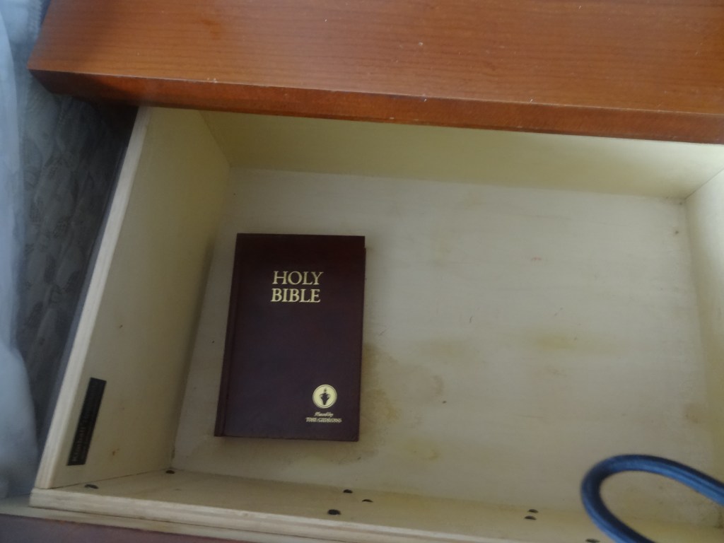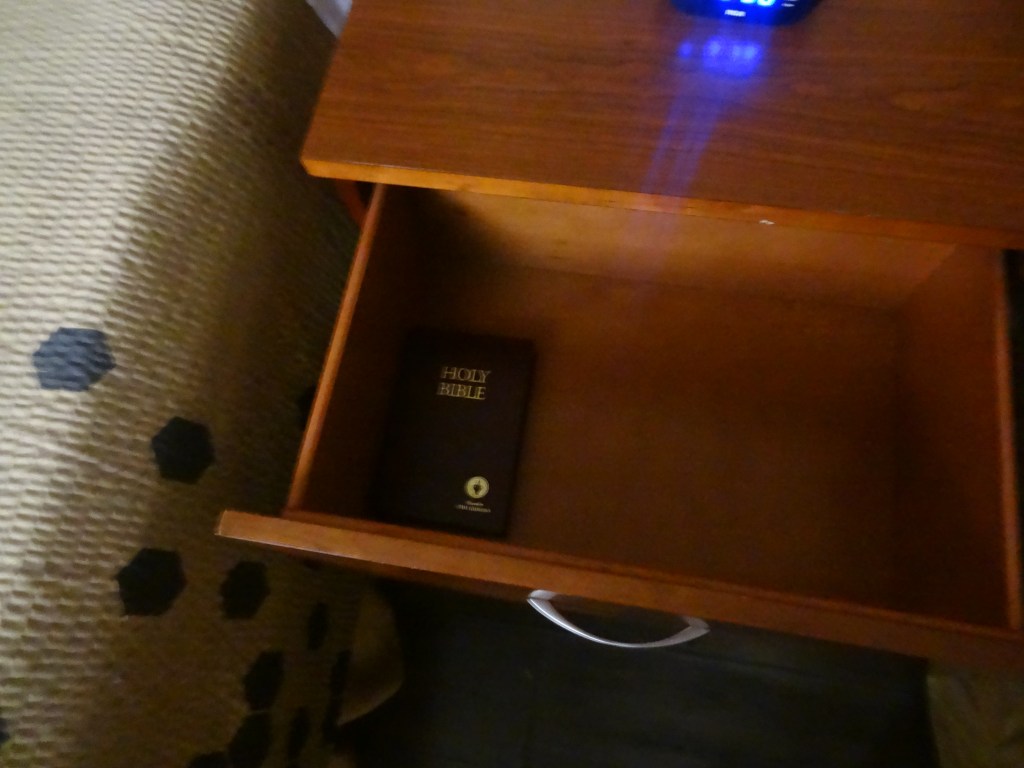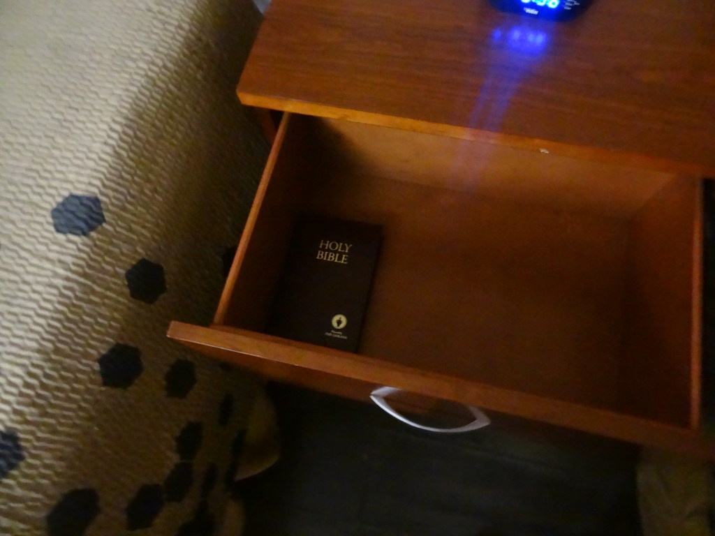 As we left our room, my job was to check if we left anything behind. I had to check every drawer, and in the nightstand’s drawers, I found a Holy Bible. That was a trend I noticed in every hotel we had been in so far. If you also are wondering about why they are kept there, Bibles are put in hotel rooms to evangelize the Christian faith. The Gideons International, a Christian men’s organization, donates Bibles to hotels in an attempt to spread the message of Christianity to passing travelers and so that people, far from home, might seek comfort or solace in the familiar words of the Bible.