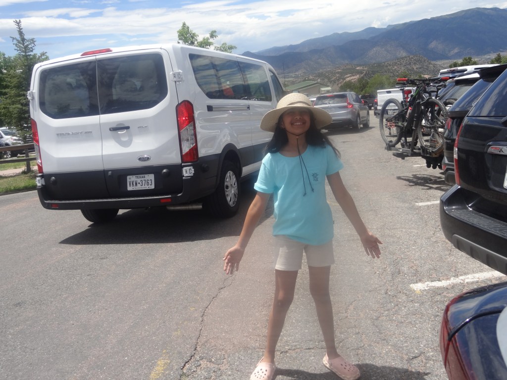 There were a couple more families, some on the same trip as us, others going to the Royal Gorge Rafting trip (extra intense rapids). Once they pulled in the bus, the outfitters attached a trailer to the end, loaded with bright orange rafts. After that, each family’s name and number of rafters was called out, and then everyone boarded the bus.