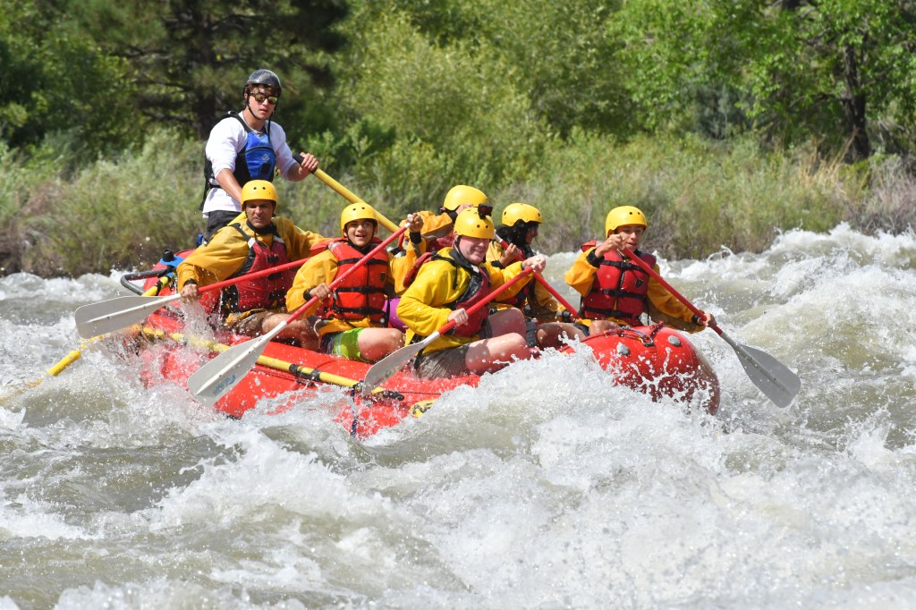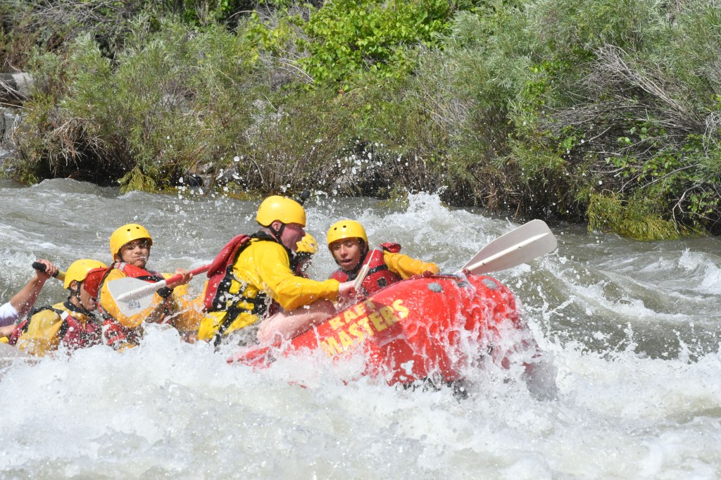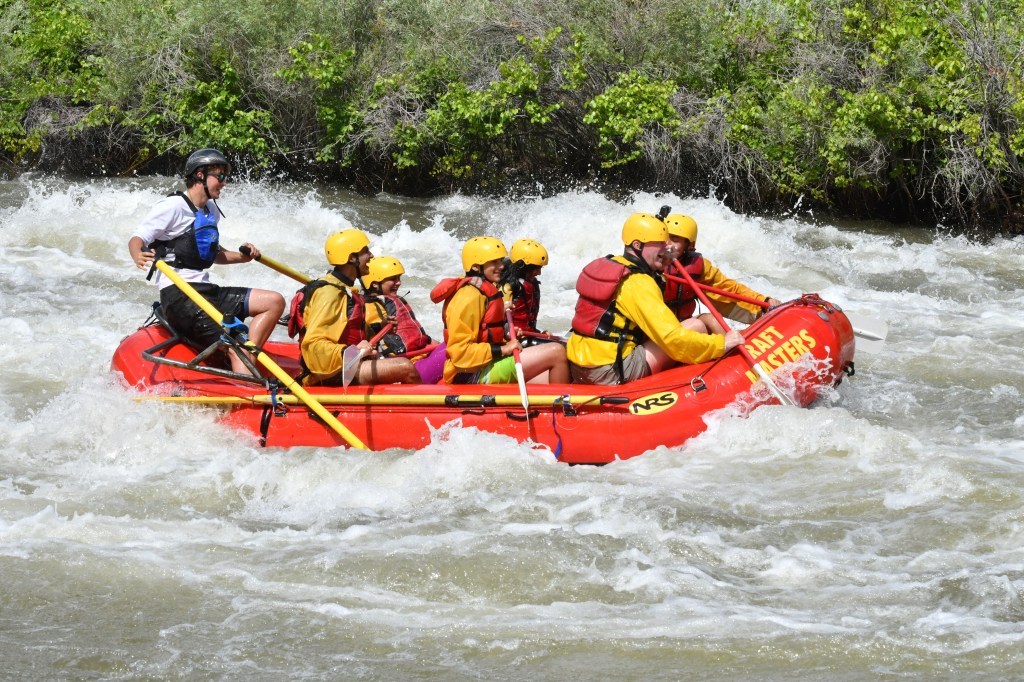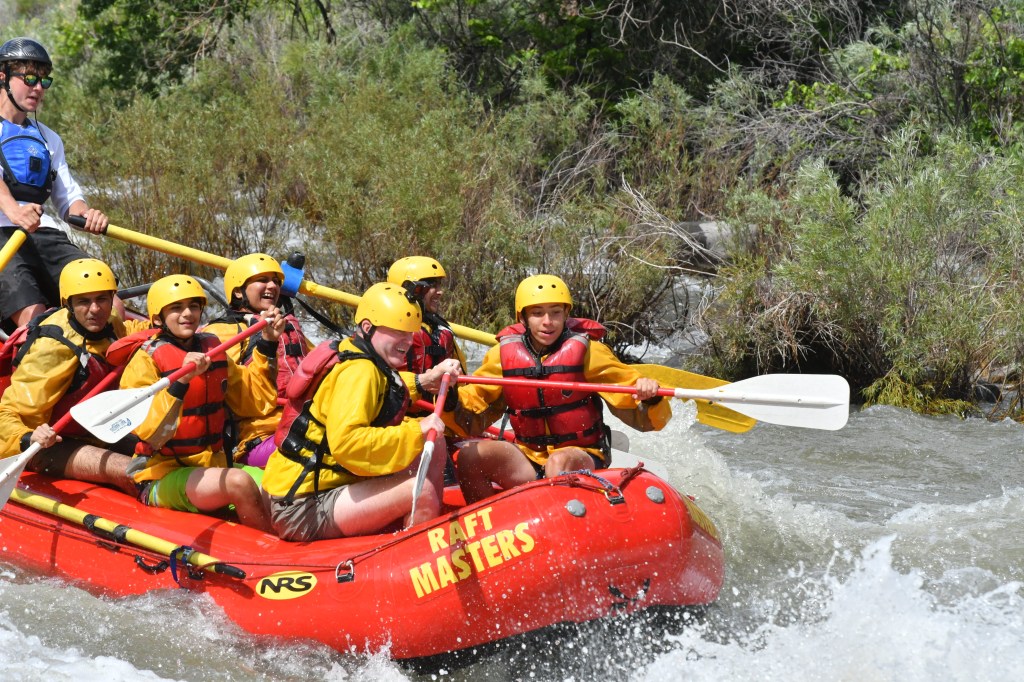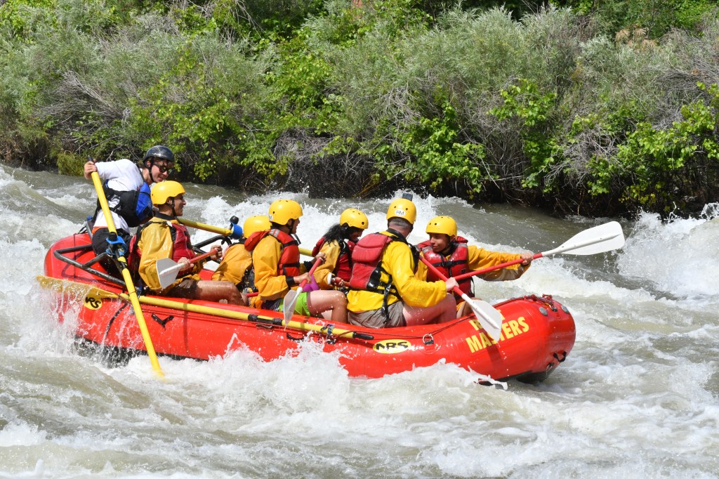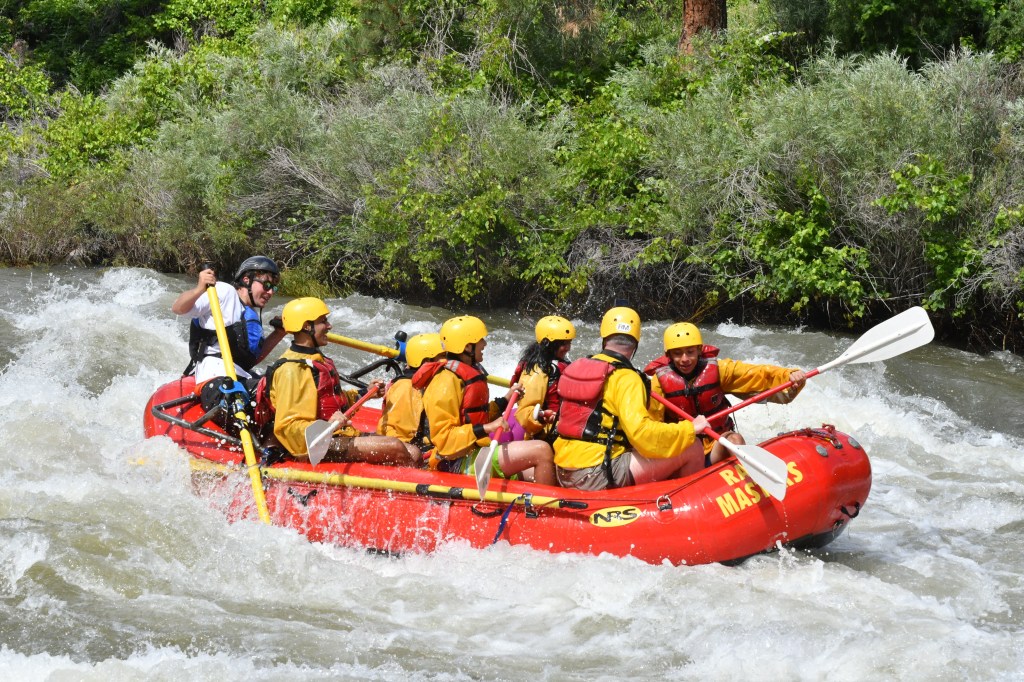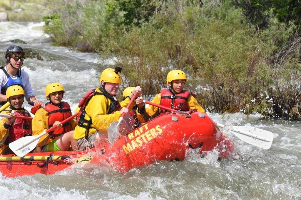 Afterward, when everyone was waiting near the rocks, Tim Slavin walked over with his son Brandon Slavin -who was around my age- to meet us. They came to Colorado from Connecticut and were leaving that evening from Denver’s airport. Noah came to call us over and then trained us on how we were going to raft and what his commands would be. I was his volunteer, and got hands-on experience on how I’d hold the paddle and what the commands would be before we started rafting! Noah had 3 commands: Forward1 (one stroke, pulling backward), Forward2 (two strokes, pulling backward), and Backward1 (one stroke, pushing forward). If you guessed the number after the action is the stroke count, you are correct!