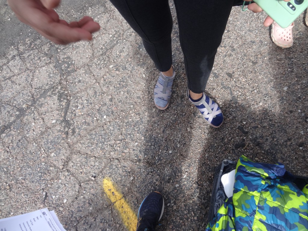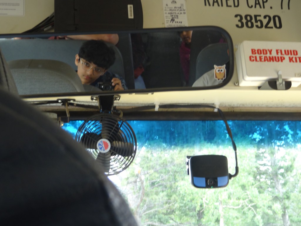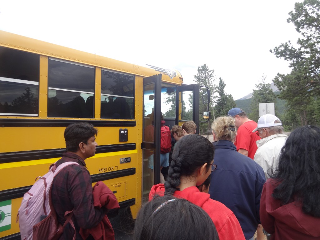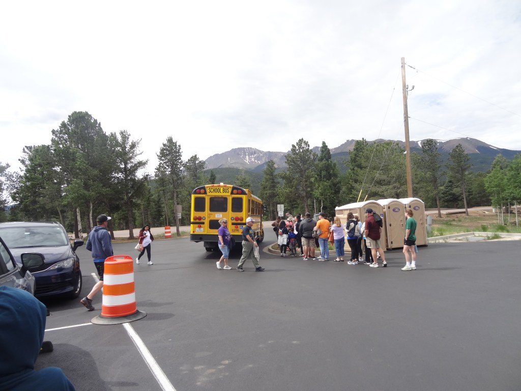 A PPAM (Pikes Peak – America’s Mountain) Shuttle was really just a school bus used to seat passengers comfortably on the drive up the mountain. I recorded that two different shuttles ran the route up and down the mountain, hence the 15-minute estimated wait time. A minute after we parked, the first shuttle came around. Only a good number of passengers (20-25) are boarded into a shuttle, and the rest are cut off. We saw a cutoff line formed, so we knew we had to wait for the next one. Grabbing jackets, gloves, and backpacks with food and water, and using the restrooms nearby, our family was ready to hop onto a shuttle, admire the views, and reach the summit of Pikes Peak.