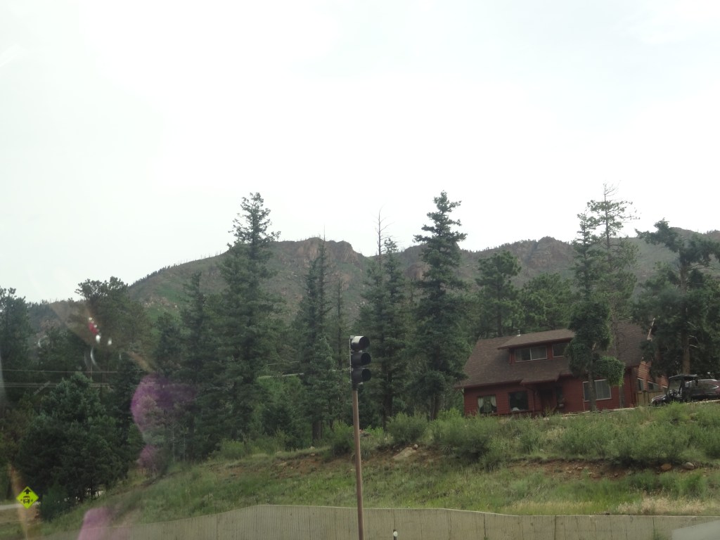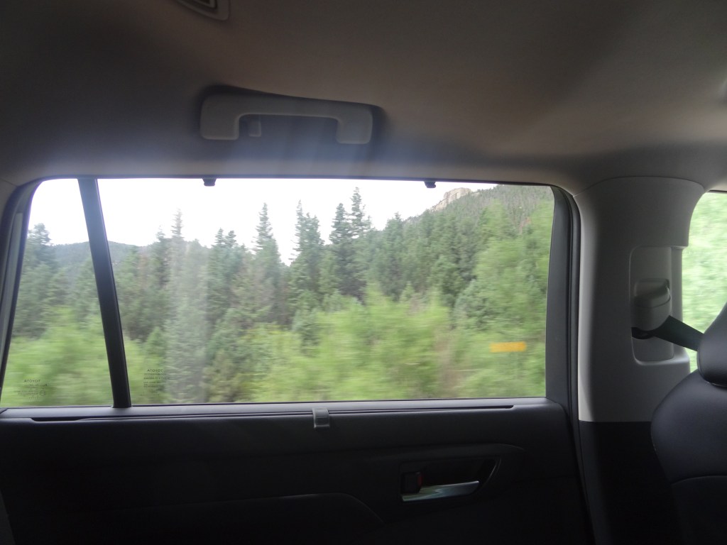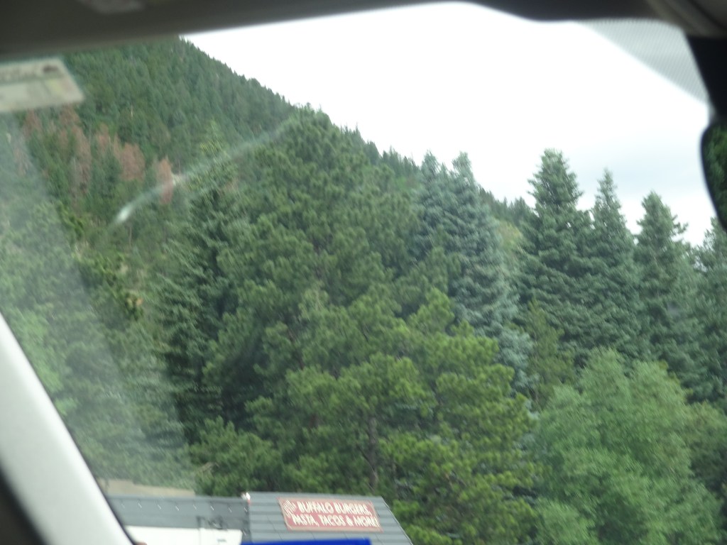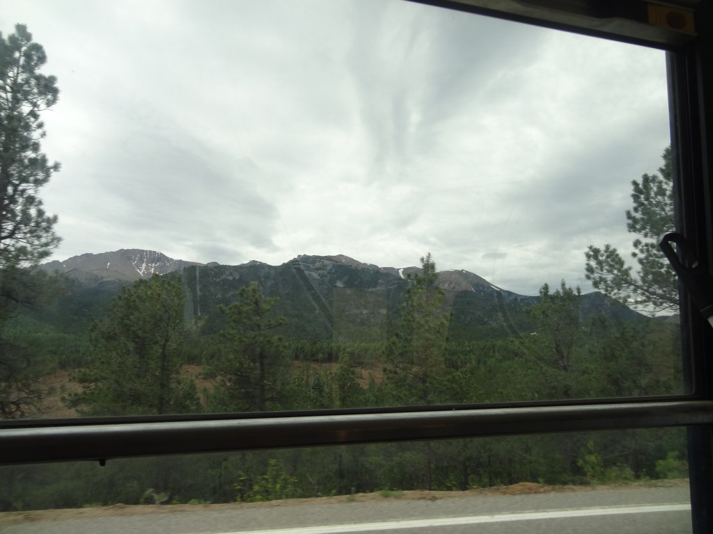As we waited, I admired the views while my parents found another family (from Dallas, Texas) and started talking with them. Pikes Peak, as gorgeous as it was, right in front of me! What a sight. Even though it was July, snow was still visible in traces around the peak of the mountain. At last, our shuttle came by. I grabbed the first seat behind the driver as we boarded, my parents and sister diagonally behind me in the seat of the next row.