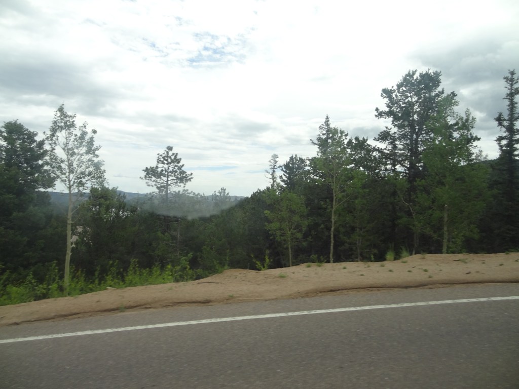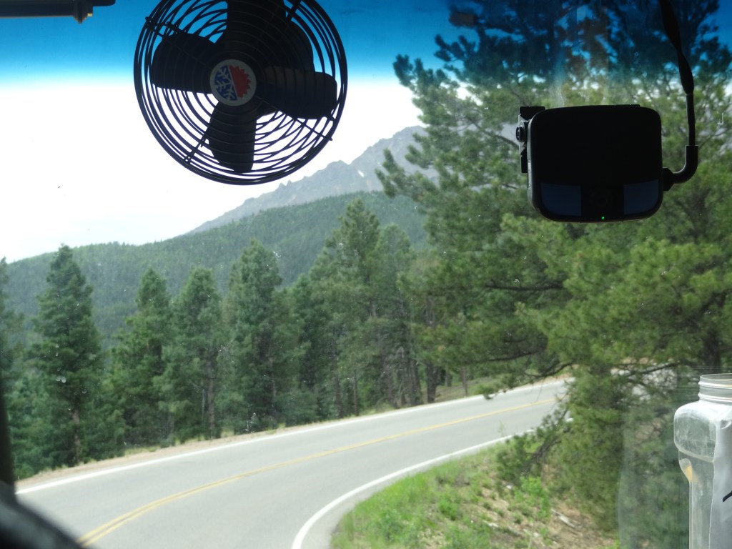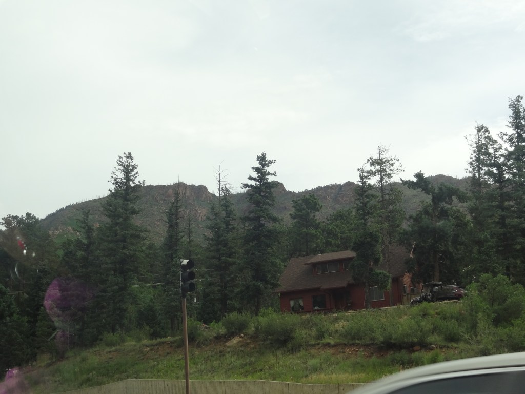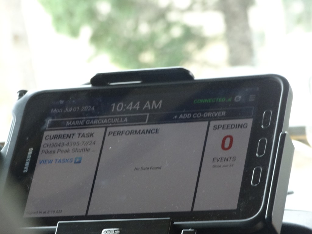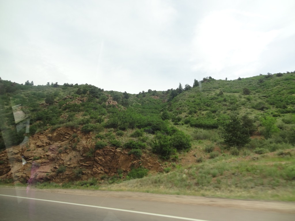 As we waited, I admired the views while my parents found another family (from Dallas, Texas) and started talking with them. Pikes Peak, as gorgeous as it was, right in front of me! What a sight. Even though it was July, snow was still visible in traces around the peak of the mountain. At last, our shuttle came by. I grabbed the first seat behind the driver as we boarded, my parents and sister diagonally behind me in the seat of the next row.