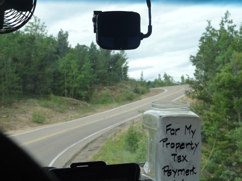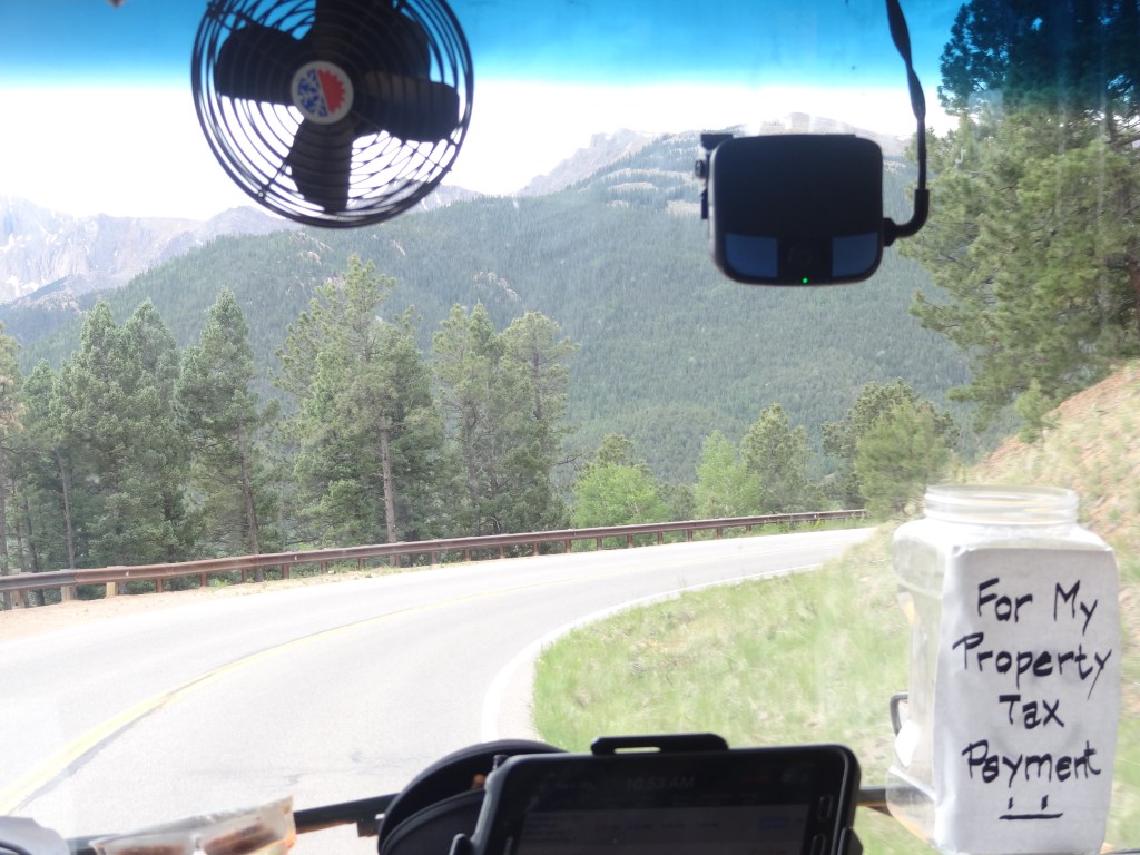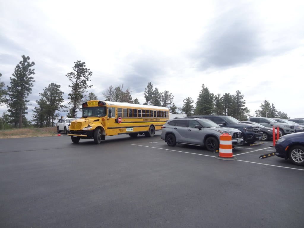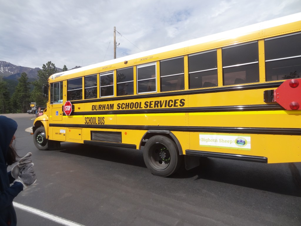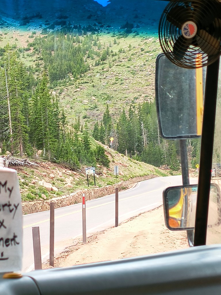 Yes, a true facepalm slap moment. None of us wanted to leave, but, you gotta do what you gotta do. We had 2 things left to do. Grab our Pikes Peak Donuts, run through the gift shop, and get down to a more breathable height. We got in the line for the cafeteria, which quickly passed, grabbed our donuts, and sprinkled them with a heartful amount of M&Ms and a little bit of sliced almonds. After spending some time in the gift shop, we went out to board the next shuttle. While my parents were down by the deck taking a few last pictures, then came the familiar big yellow vehicle: the PPAM SHUTTLE BUS! My sister and I raced to call them up, and then once we were all together, we got onto the bus ride down. Along with us and more people from the summit, there was a family who just came up, but weren’t properly geared (they were wearing shorts) and just as they stepped out they came back in. So folks, remember to dress appropriately for mountain weather.
