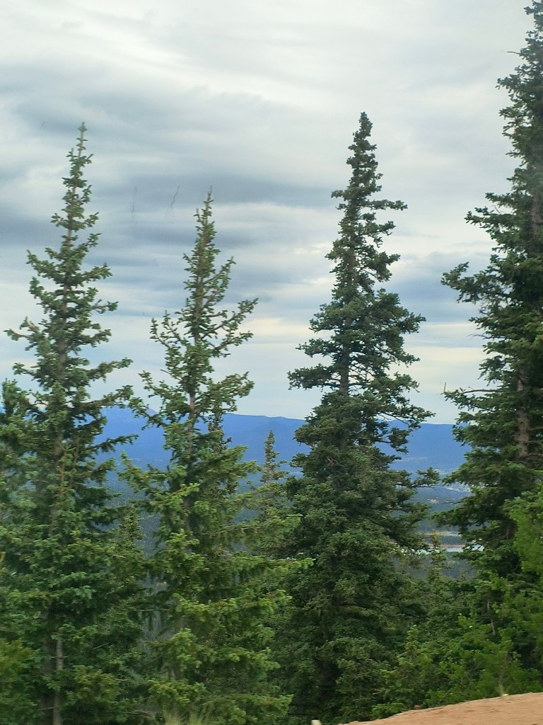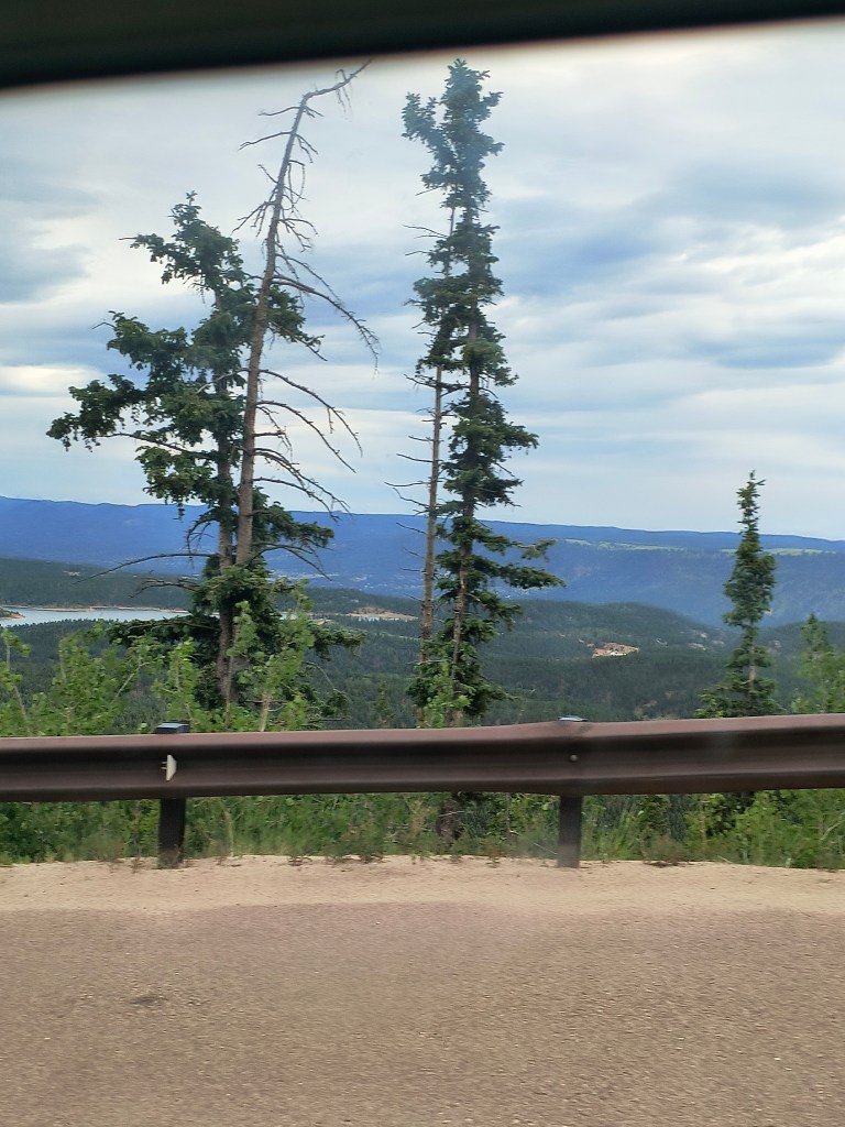 As we started leaving, getting back out and onto mile 7 of Pikes Peak Highway a nice and clear lake came into view: The Crystal Creek Reservoir. Pulling over for a quick look around. My dad, sister and I headed into the visitor center to check things out while my mom headed down toward the lake. After looking around at some things in the gift shop, my dad came to take us down to our mom.