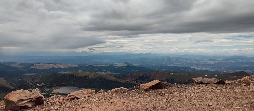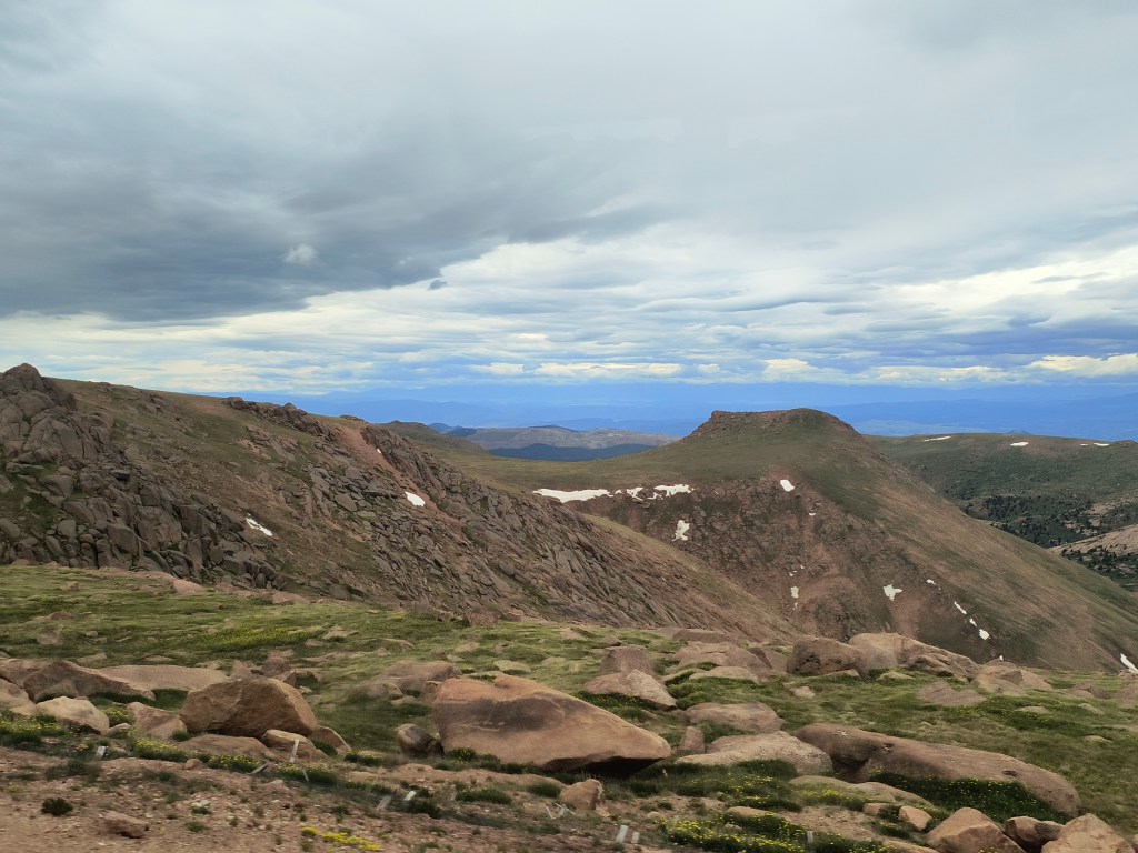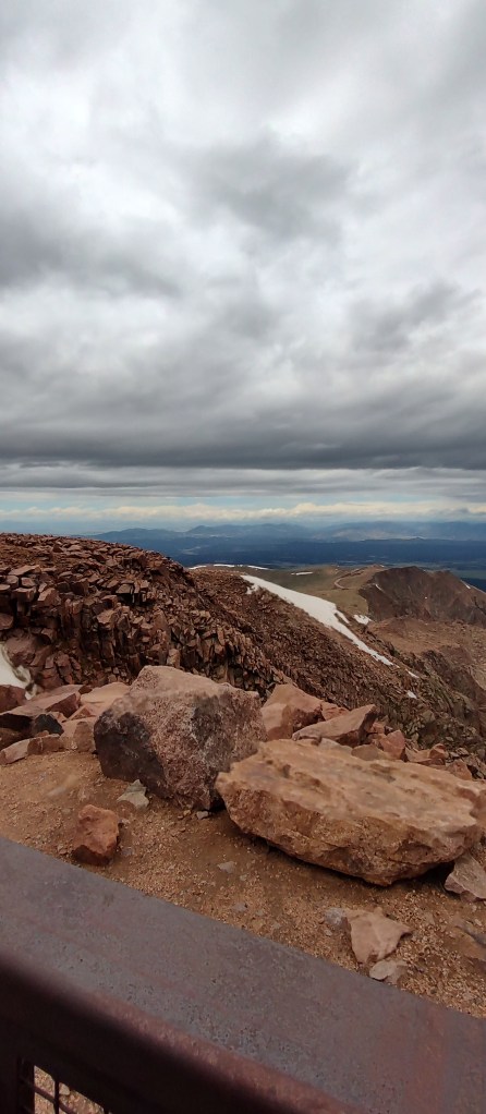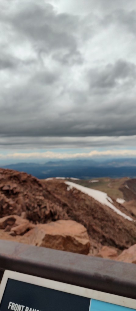 Satisfying with my urge to know more about Pikes Peak, I finally met up with my parents and sister. Waiting in the front area for my mom to show up from the bathroom, my dad asked a ranger if the conditions would clear up. She said not until 5pm, but if we were lucky, in a few minutes. And as if my wishes came true, watching from the window, the sky gradually turned blue! I yelled out to my dad about the clear sky, and we rushed out to adore the views from 14,000+ feet above.