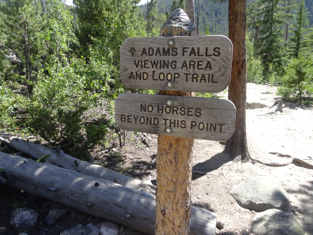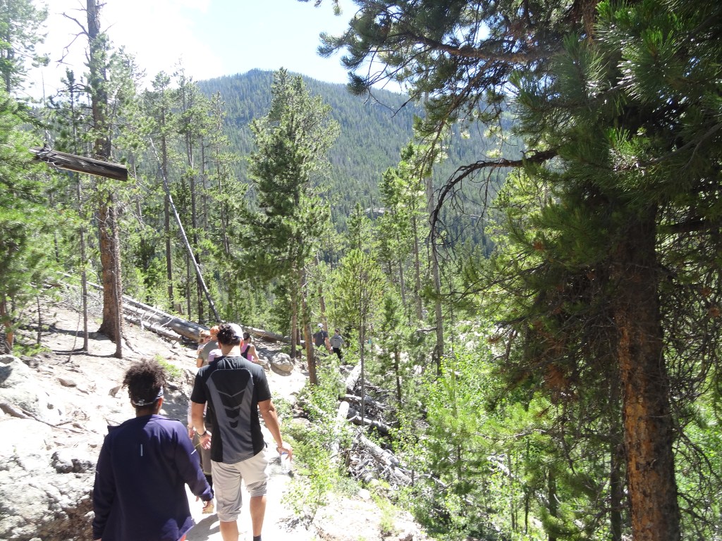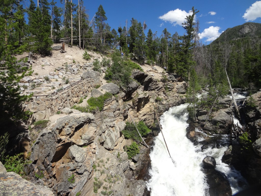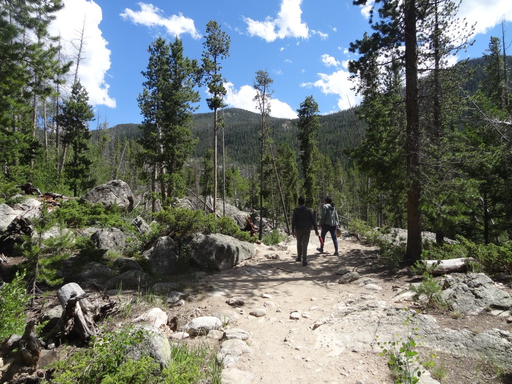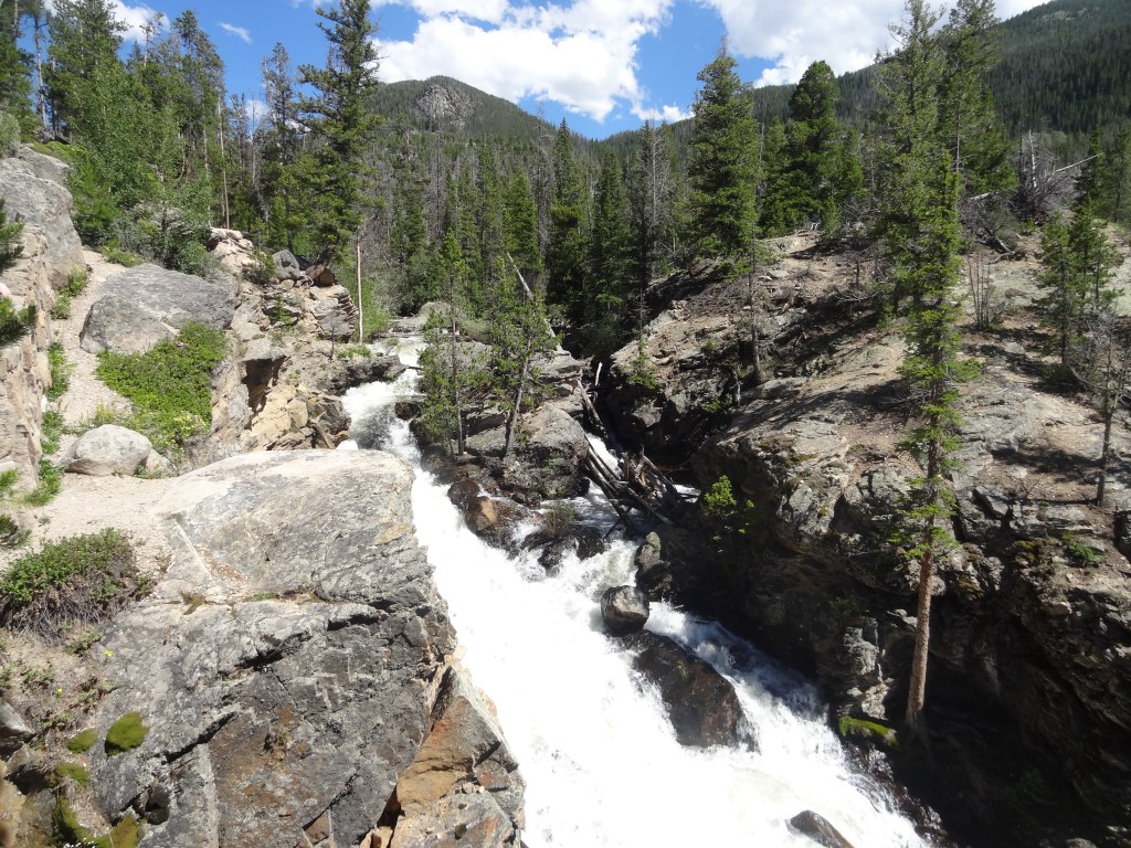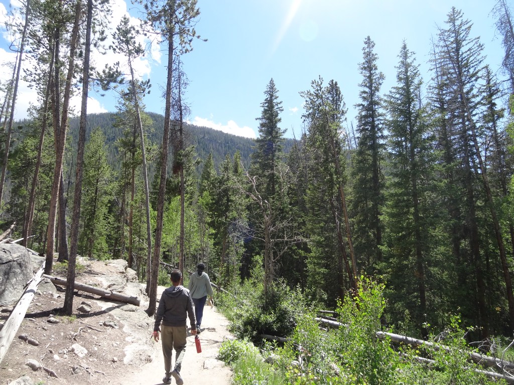 Turns out there was a trail there that started near Grand Lake. Setting out on the East Inlet Trail, we ventured off to see Adams Falls. It was a 2-mile round trip on a forest-like trail, with leafy trees and pines separated by a rocky path. A clearing opened up to a bumpy area surrounded by trees, with the sound of rushing water. There it was, Adams Falls!