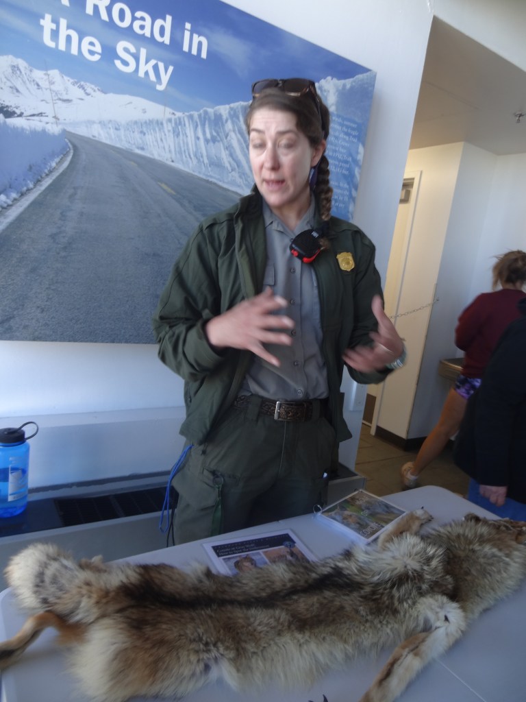 Wolfs vs Coyotes! Taking a quiz on pictures, we got most of them right. The difference between the two is that Coyotes are smaller than wolves but have a sleeker body, narrower snout, smaller paws, and larger pointed ears than wolves. Additionally, Rocky Mountain National Park inhabits coyotes only, so if you ever think you saw a wolf in the Rockies, you now know it was a coyote. The ranger presented everyone with a professionally preserved coyote pelt. We got to feel the paws, the snout, and the fur of the coyote, getting a more hands-on feel of what a Coyote really is. Thankfully, it was just a pelt though. Otherwise…