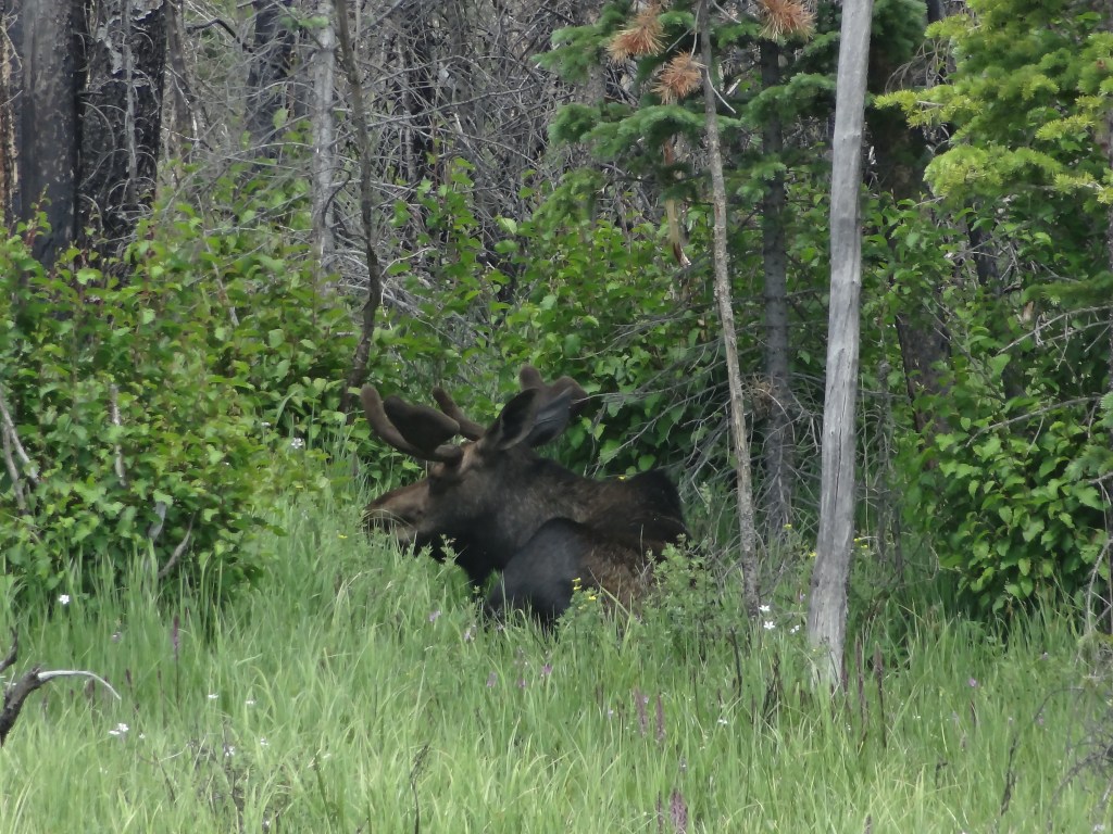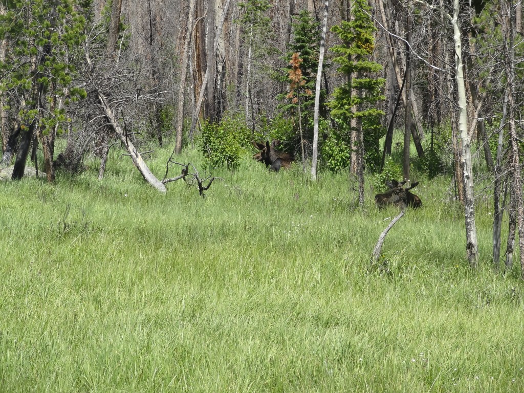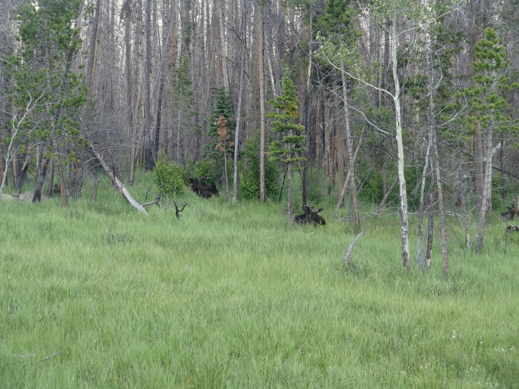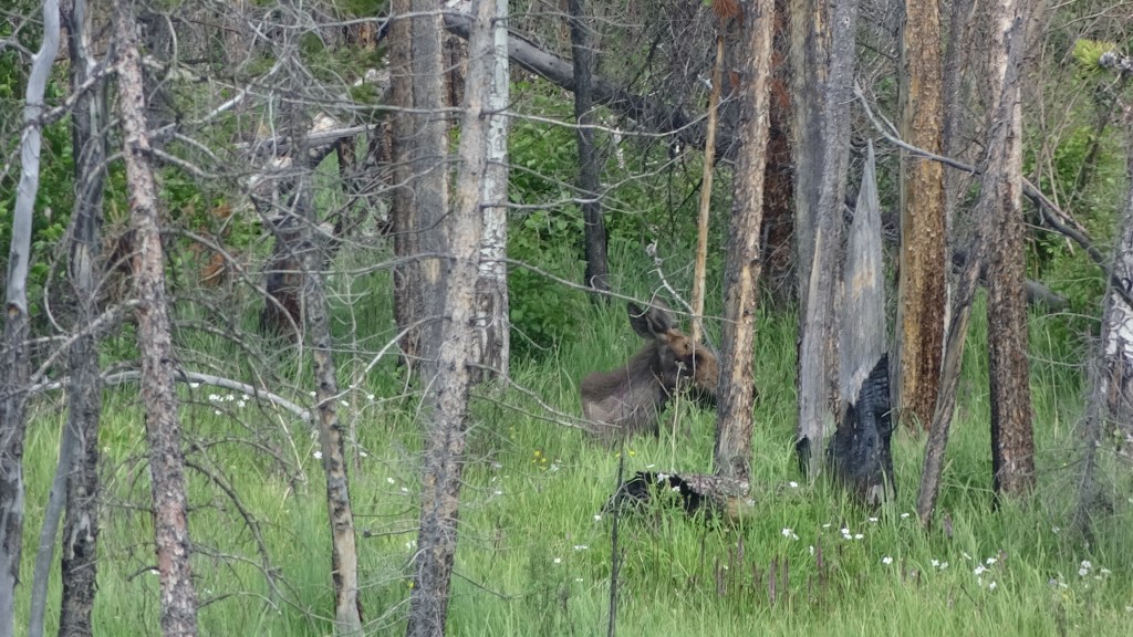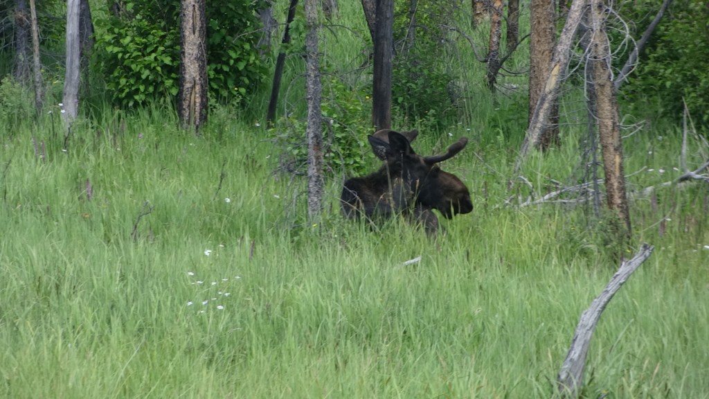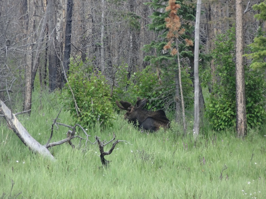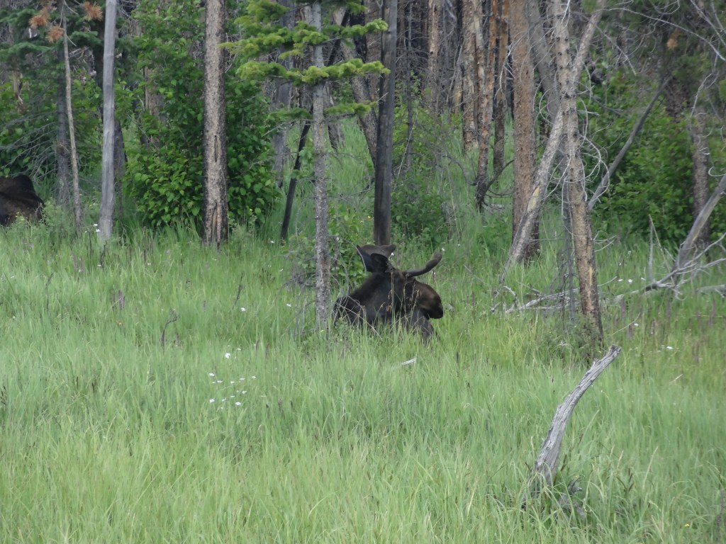 The scenic drive continued, but after a while, we saw burnt trees. More and more, with goldish-yellow grass on the bottom. There was a green patch in the middle, and a couple of visitors standing by. Hopping out to see what it was, my sister and I walked over and asked. An elderly lady helped us discover a family of 4 MOOSE!