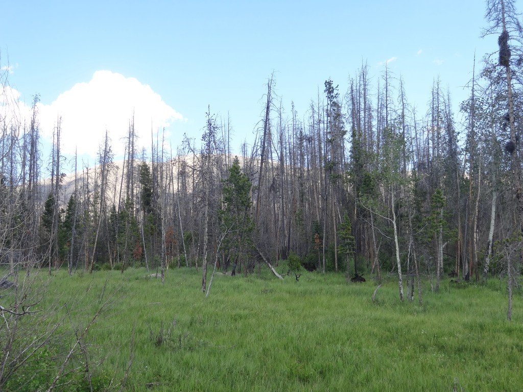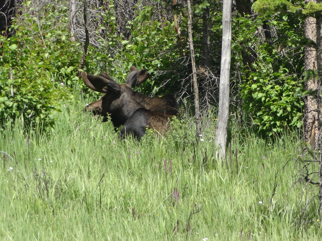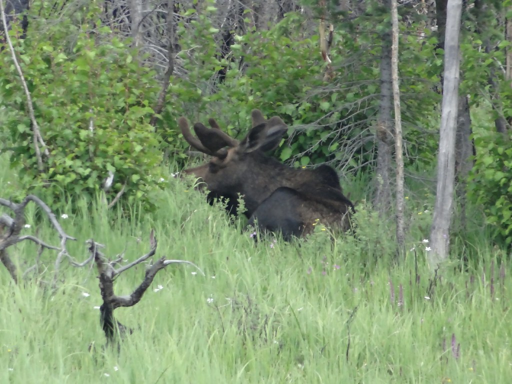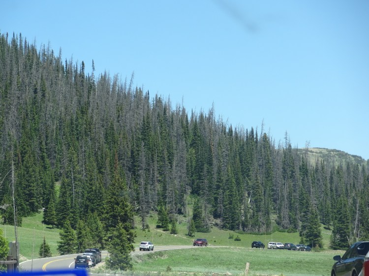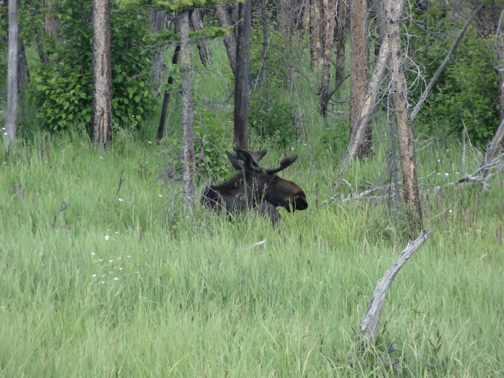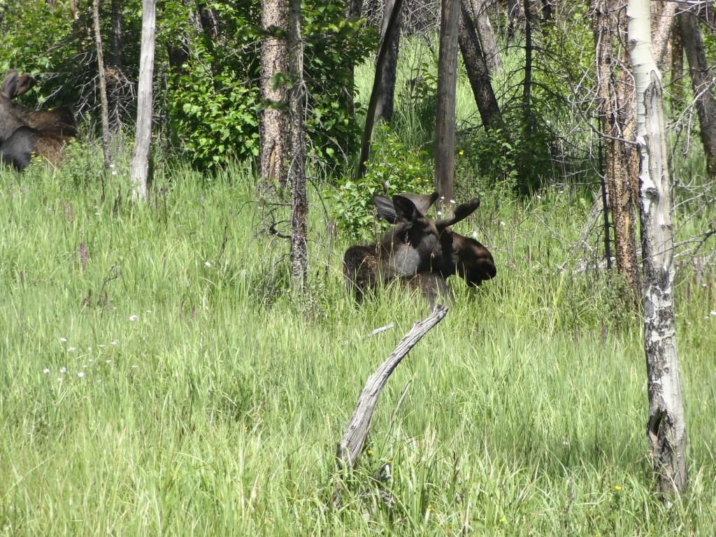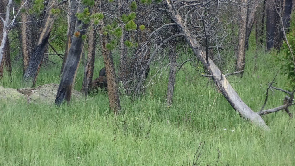 The scenic drive continued, but after a while, we saw burnt trees. More and more, with goldish-yellow grass on the bottom. There was a green patch in the middle, and a couple of visitors standing by. Hopping out to see what it was, my sister and I walked over and asked. An elderly lady helped us discover a family of 4 MOOSE!