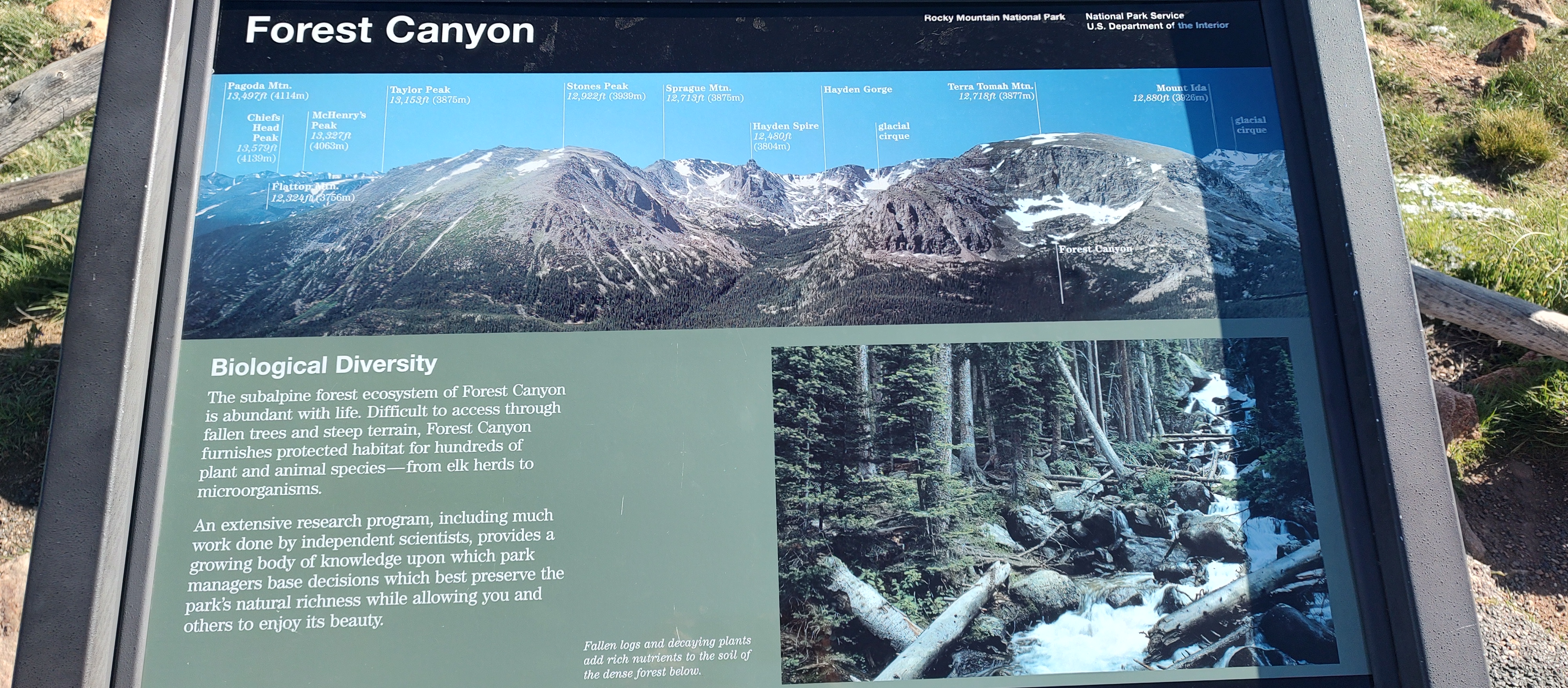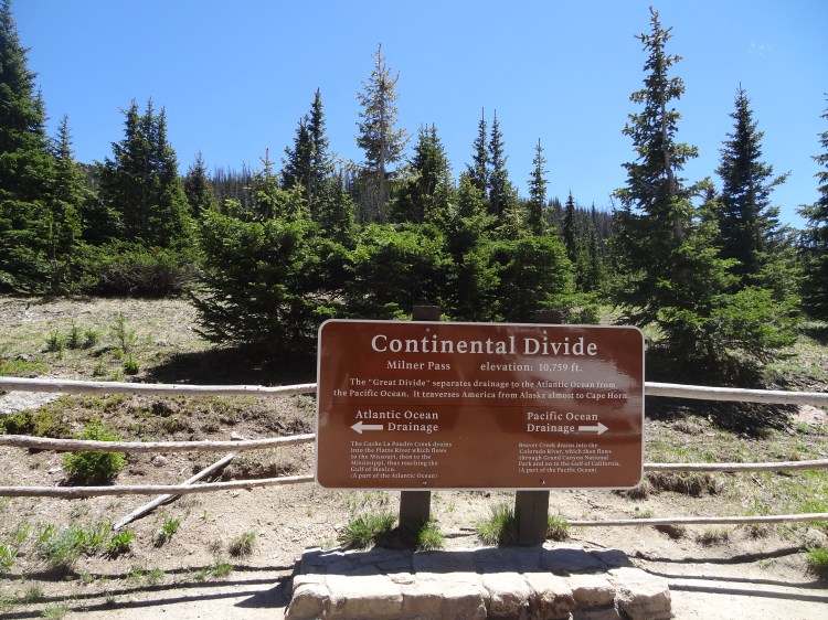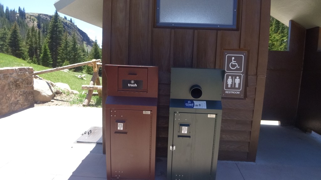 After resuming our drive, then was a long curved turn that went downward to a forest area, into the subalpine region, right to the Continental Divide! The Great Continental Divide is a high and continuous mountain ridge range that separates drainage either West to the Pacific or East to the Atlantic. It was a cool feeling to be at the center of a dividing line. The area was also home to Milner Pass, so explored the area, going a little up the Ute Trail to rest around a lake, and after using the restrooms, we were back on the road again. Speaking of the restrooms, there were cool Bear Proof Trashbins made specifically for RMNP that could only be accessed by humans as they either couldn’t come within a bear’s reach or fooled the bear itself.
