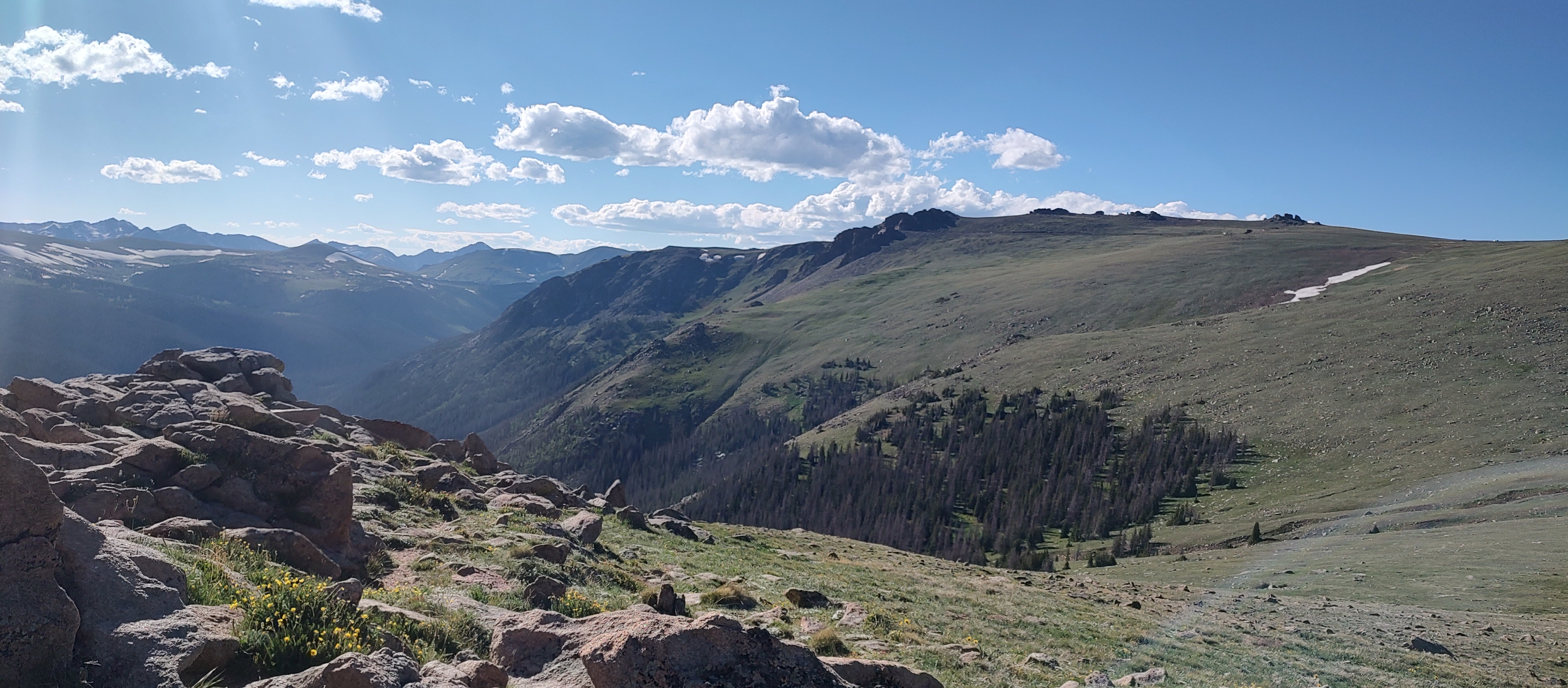 Along the way came the Forest Canyon Overlook and Trail, which my dad and I decided to adventure out into. This was a place to get clear views of the Alpine Tundra and surrounding mountains of the area. It was a short walk down to the viewpoint, but the area was really windy to go around. There was a rock structure you could sit around in the center to look at various views from up high.