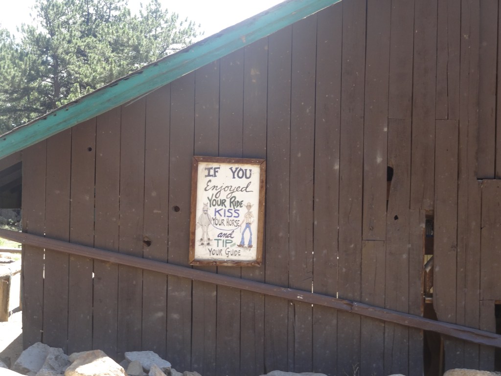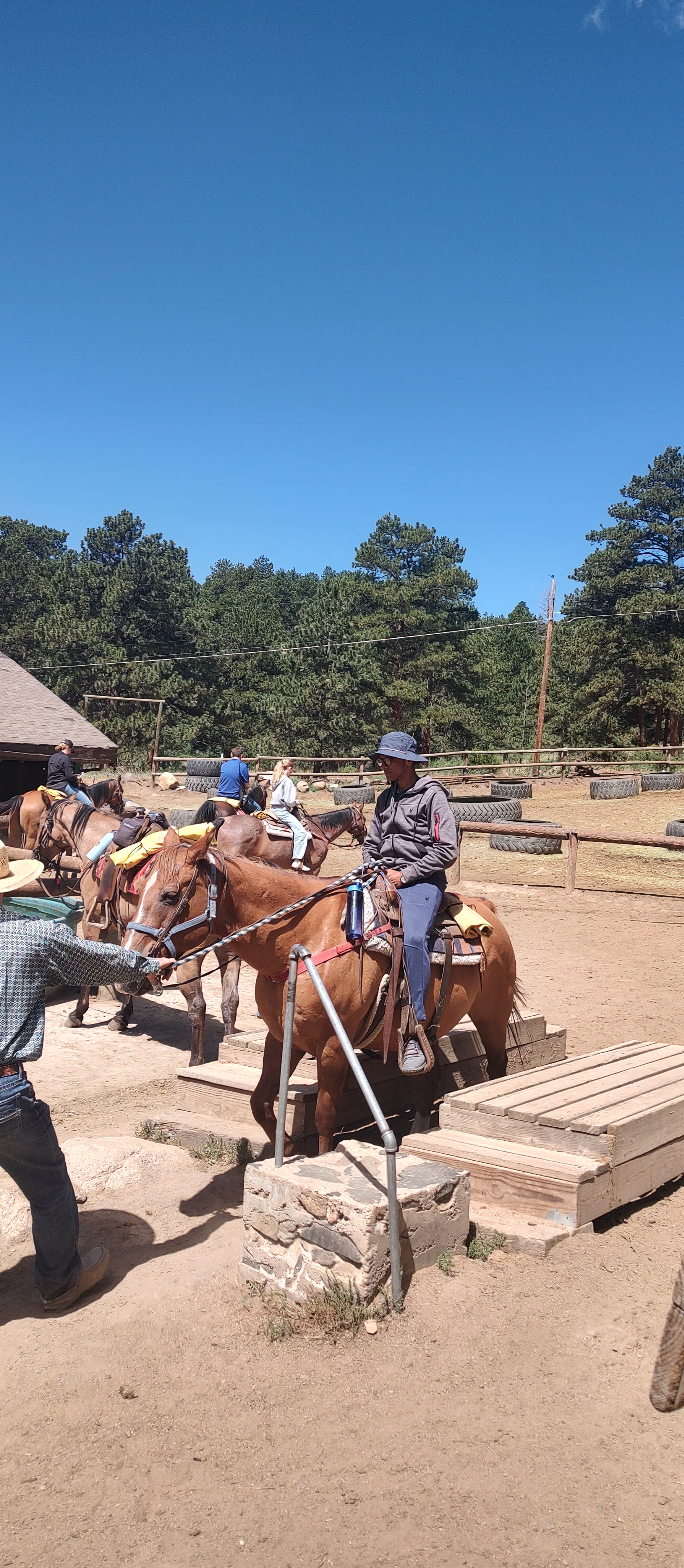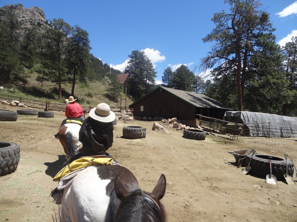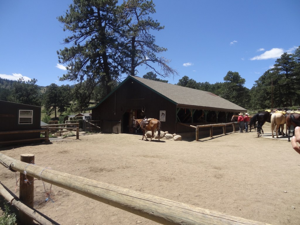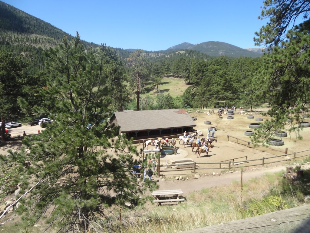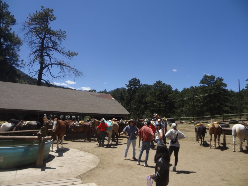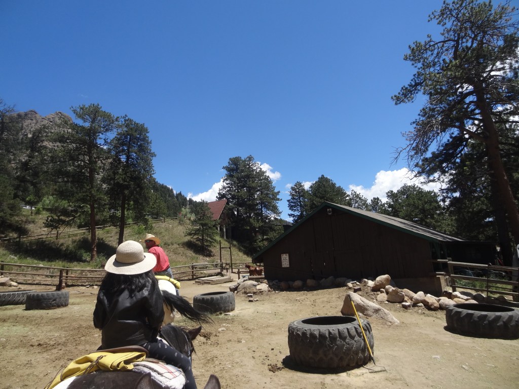 My mom decided that she didn’t want to go on the ride because she already rode horses when she was young and wanted to read a book she had brought. We got to see city views after a long time in the wilderness, and saw the iconic Stanley Hotel on the way! Finally, we arrived for our horse ride around 11:15 AM because of the light traffic on the route. There was a sign directing us to the stables, and after parking, we headed down a dirt path toward our ride.