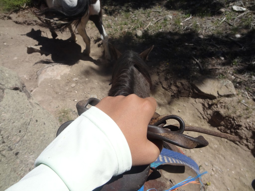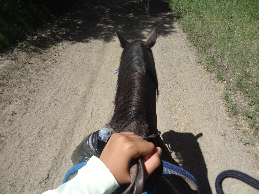 Jessi had our water bottles strung so that we could hang them on the saddle, and we walked towards the main gate where we’d get our horses walked to us so that we could mount them. Telling the guides there on what horse we were told to ride, they went back into the barn to walk the horse out. Moses and my sister went first, then my dad and Ronny, and finally, Blue was the last horse to come out. The guide yelled out Blue, and then I was off after waving goodbye to my mom. The guide hooked my water bottle onto the saddle and then guided me on how to place my foot on the straps and hoist my body around Blue’s shoulder. Pretty simple: you push down with your left foot and then swing over.