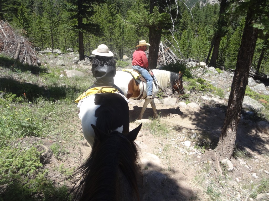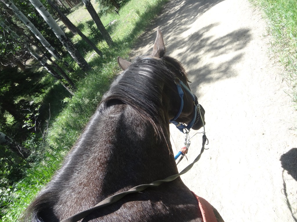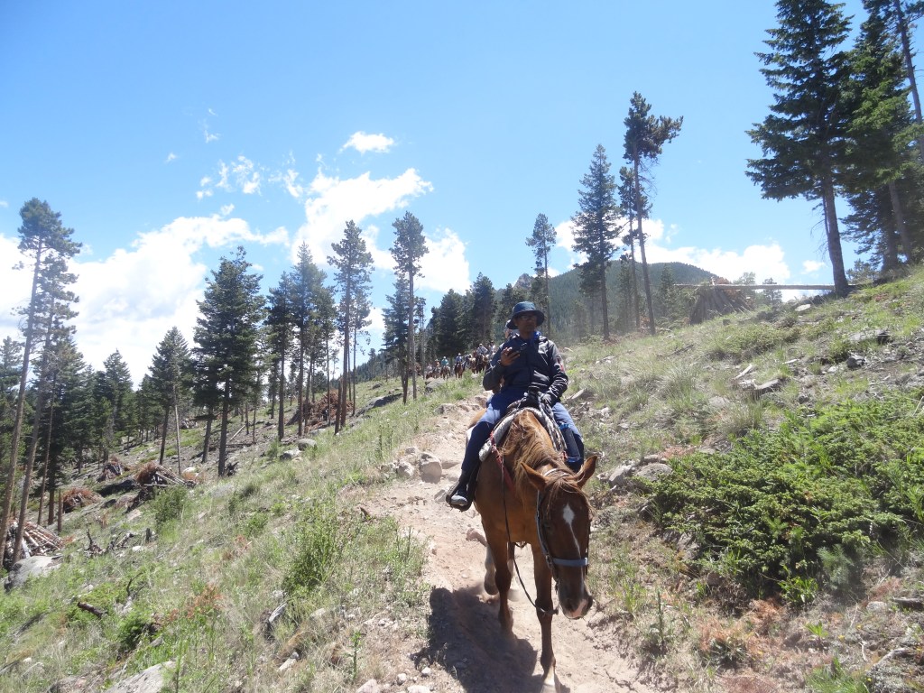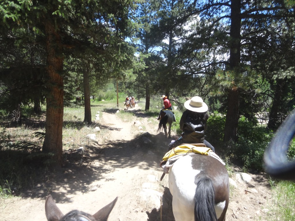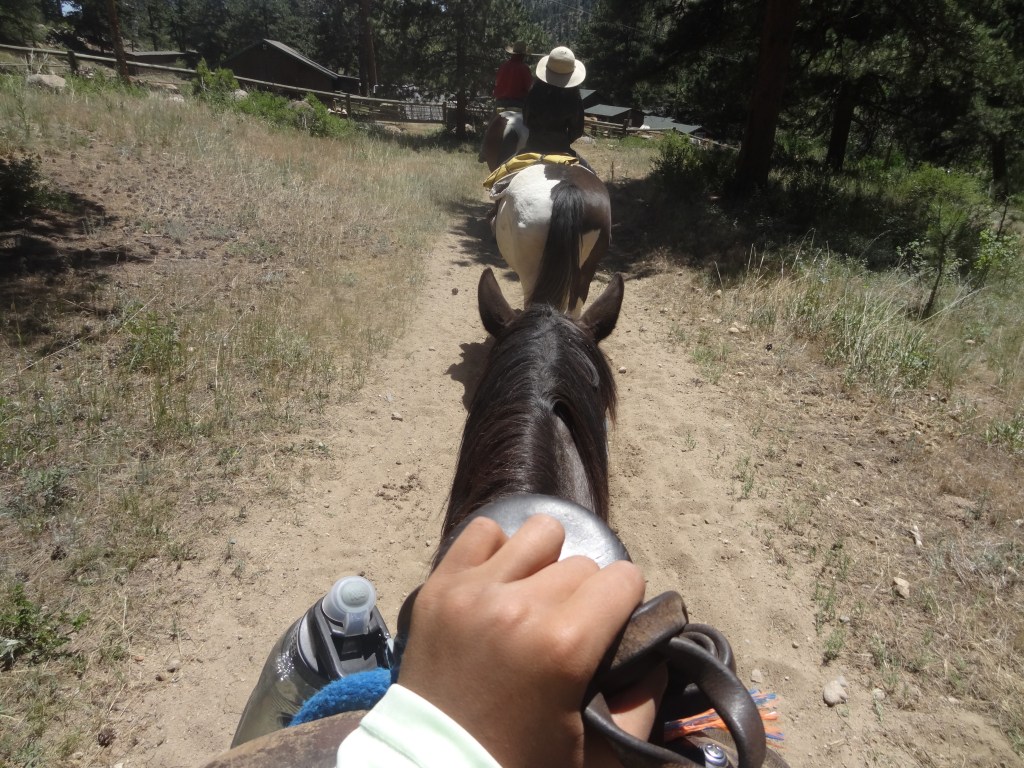 After quickly adjusting my straps and teaching me how to control and steer Blue (basically tugging in the directions you wanted to go), I was off to the line where we’d start. Our trip’s guide’s name was Ricky, and he was a senior at Georgia State University who came to Colorado to help out on horse tours. Ricky put horses in order based on rider experience and age. My sister was at the very front behind Ricky and his horse, Choctaw, with Blue and I following and my dad and Ronny just behind me. Around 5 more people were on our trip, lined up behind my dad.