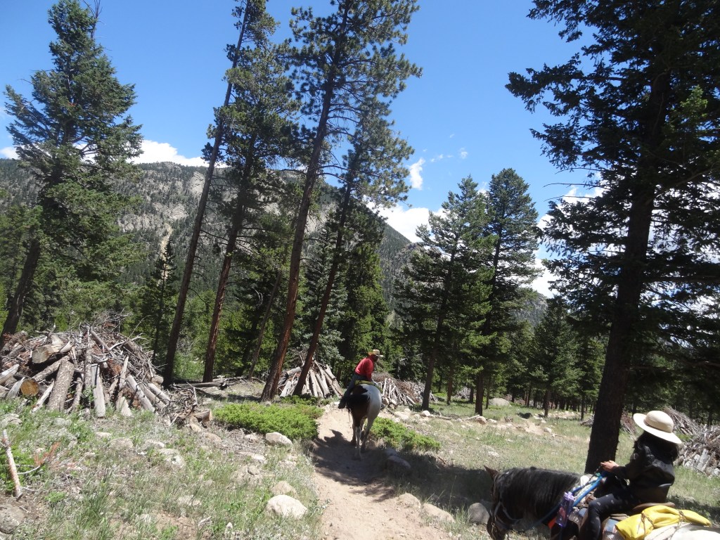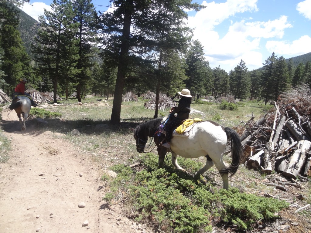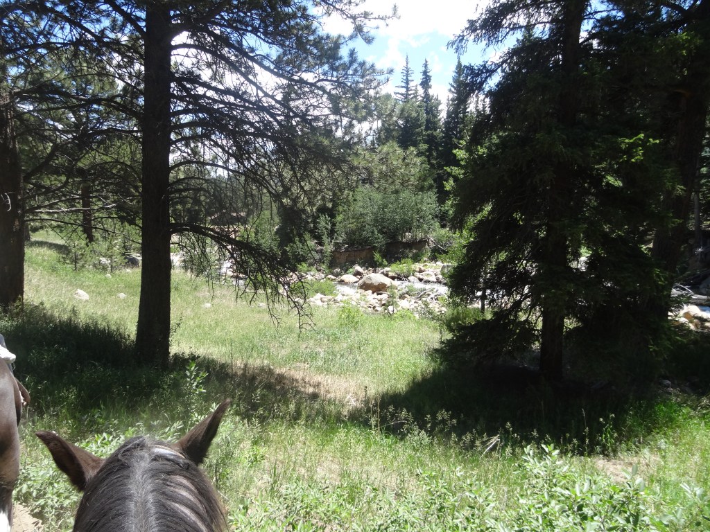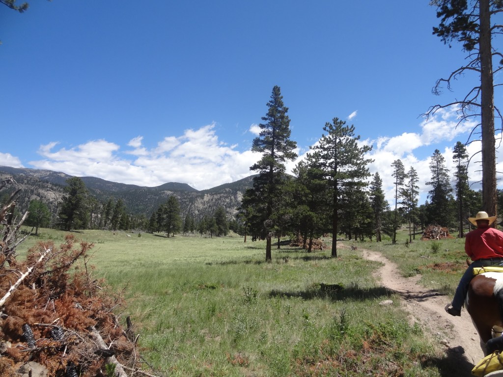 Turning to a dropping point where you had to lean back and let your horse climb down, our group emerged into the Hidden Meadows. The reason it’s named that way is because you can’t really see it unless you actually get in! From Deer Mountain, nobody would have guessed that there was a meadow down there, because the terrain hid it, and the curved dropping point was the one that led to it. Wildflowers dotted the area, surrounded by the snow-capped Mummy Range. You could see a couple of birds, as well as squirrels scampering around the area.